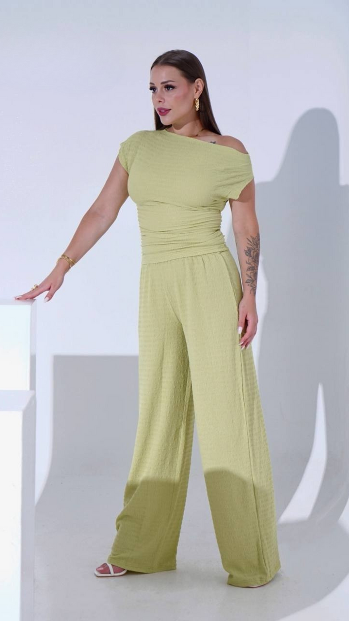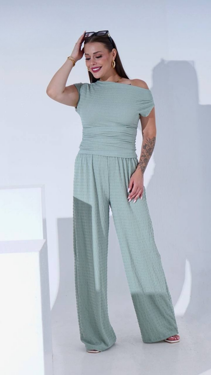 Chic and contemporary, this crushed-texture pants set offers both style and ease in one coordinated look. The pleated fabric subtly plays with light, lending a refined shimmer that draws attention without overpowering. The tailored top pairs seamlessly with the relaxed-fit pants, creating a balanced silhouette. Whether you’re going for a casual lunch or an evening out, this set adapts beautifully with accessories.